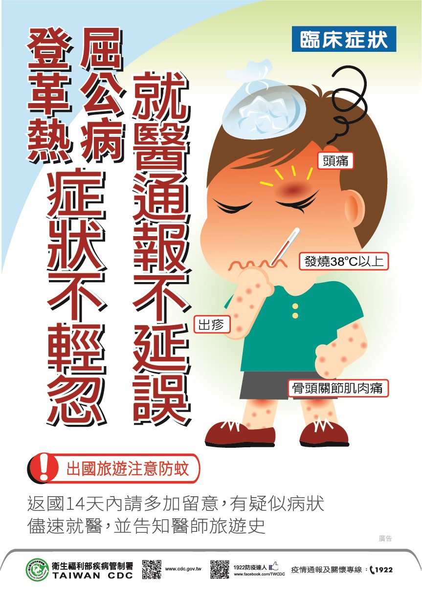 市府衛生局呼籲民眾若發現疑似登革熱相關症狀,如發燒、頭痛、後眼窩痛、肌肉痛、關節痛、出疹等,應儘速就醫並告知旅遊史及活動史,以爭取防治的黃金時間。民眾如果確診登革熱,請不要慌張,儘量在家休息減少外出,並配合衛生局疫情調查,請巡視家中紗窗是否有破損,睡覺時要掛蚊帳,遵照醫師指示服藥、多喝水。嘉義市共有40家登革熱快篩醫療合作院所,如需相關資訊,請參閱嘉義市政府衛生局網頁/登革熱專區/醫療訊息或電洽衛生局05-2338066轉疾管科。