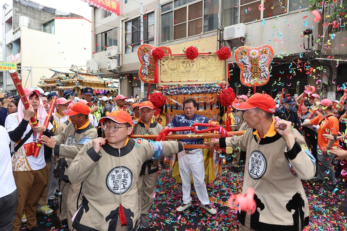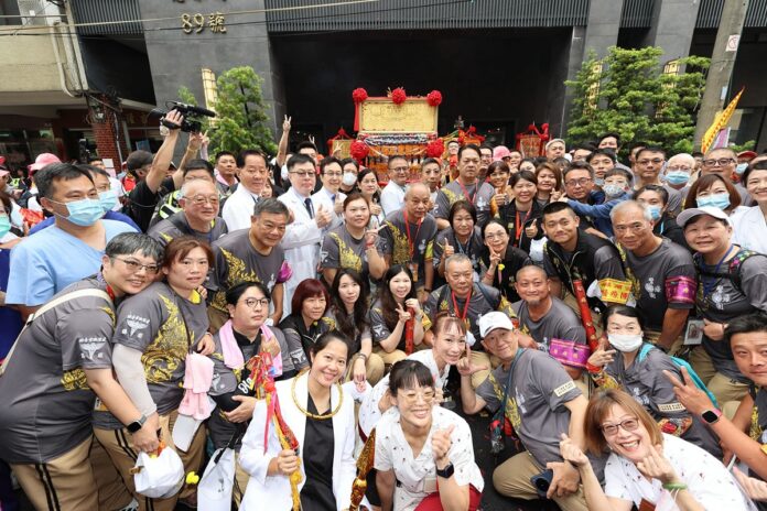 大甲鎮瀾宮媽祖遶境進香回鑾上午將近9點鑾轎在員林市宏仁醫院停轎,由醫護人員扛轎為患者祈福。(圖/宏仁醫院提供)