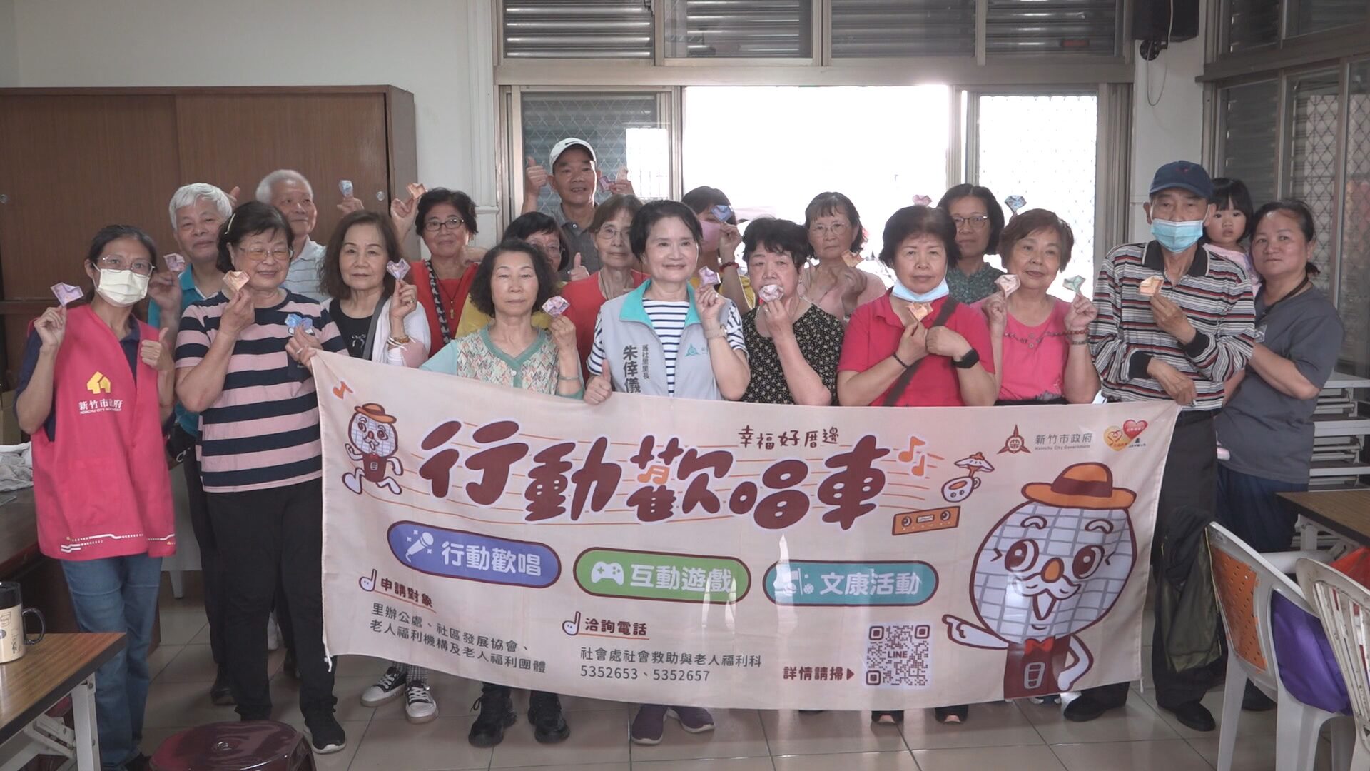 一群舊社里長輩齊聚一堂,在這福德祠石頭公的對面,進行文康活動,大家一起做暖身操,也一起做摺紙,也一起喝茶聊天,新竹市舊社里長朱倖儀表示,今天來的人數最多有21位,希望鼓勵長輩出門活動,動動腦,也鍛鍊筋骨。