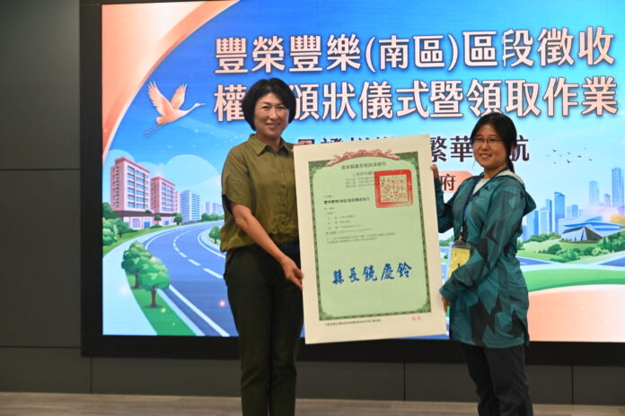 臺東縣政府完成「豐榮、豐樂(南區)區段徵收」案抵價地相關所有權登記作業,縣長饒慶鈴24日發出第一張權狀,她指出,為進一步發揮行政效能並縮短地主開發準備期,這片土地正進行相關公共設施工程,縣府同步先行辦理產權登記及發狀作業,讓地主可提前規劃,預計10月完工後即可點交土地。