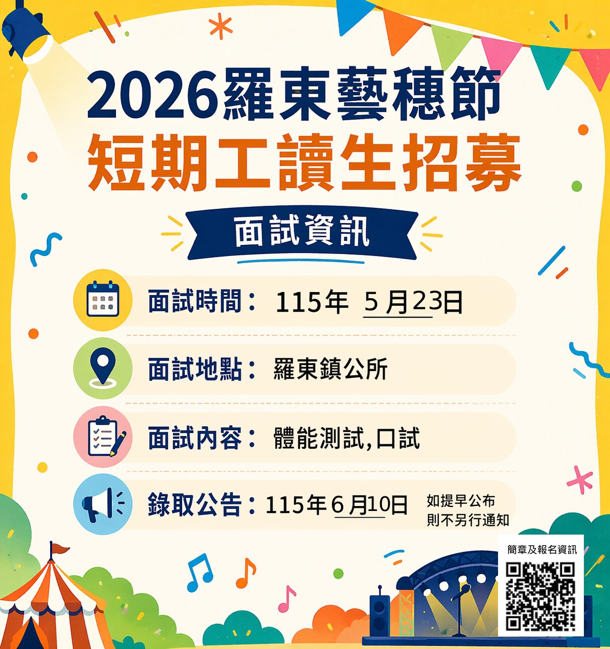 2026羅東藝穗節將於7月11至8月2日舉行,羅東鎮公所招募暑期工讀生,暑期工讀自4月30日起至5月20日止開放網路報名,預計招募55名,分為四個組別「媒宣組」、「活動組」、「市集組」與「機動組」,採線上報名。詳細資訊可參閱招募簡章,6月10日將於羅東鎮公所網站及臉書公佈錄取名單(若提早公布則不另行通知)。