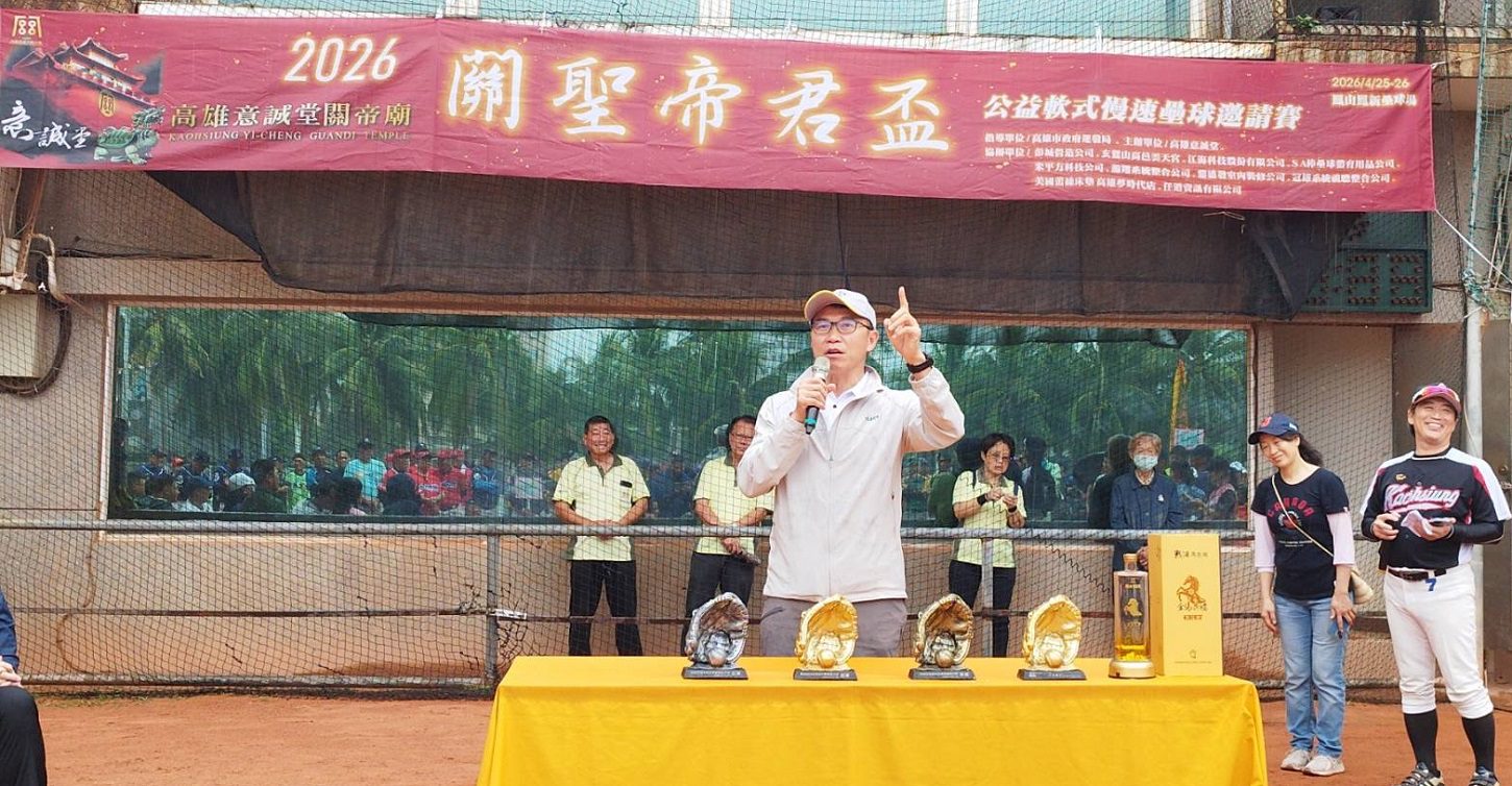 高雄鳳山周末熱鬧非凡,一場結合宗教信仰、體育競技與公益理念的慢速壘球賽正式登場,不僅吸引政界與地方人士到場支持,更匯聚企業與宮廟力量,以運動為媒介傳遞善念與正向價值。2026年首屆「意誠堂關聖帝君盃公益軟式慢速壘球邀請賽」於4月25、26日在鳳山鳳新壘球場舉行,開幕典禮由立委賴瑞隆、立委許智傑、內政部次長董建宏、高雄市政府副秘書長王啟川等人出席,並共同主持開球儀式,為賽事揭開序幕。