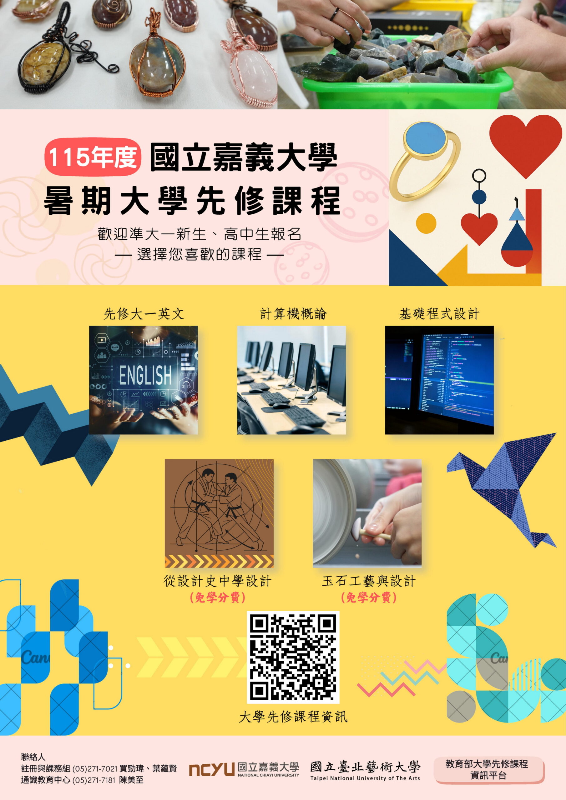 嘉大2026年預計開設5門大學先修課程,分別為「基礎程式設計」、「計算機概論」、「先修大一英文」、「玉石工藝與設計」及「從設計史中學設計」。課程內容兼具科技素養、英語能力與美感思維,讓學生在AI時代不再只是知識的接收者,更是資源的整合者。先修課程不僅是學分的累積,更是一場「心理建設」,嘉大作為南臺灣重要的人才培育基地,期待透過先修課程,讓學生學會如何利用科技工具進行深度思考,而非被科技取代。為鼓勵青年自主學習,並配合國家人才培育政策,嘉大今年特別推出兩門免收學分費課程:「玉石工藝與設計」及「從設計史中學設計」,歡迎有興趣的學生踴躍報名,加入嘉大先修課程的學習行列。
