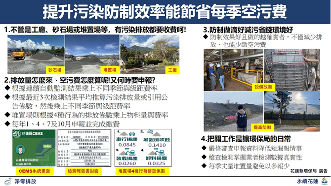 花蓮縣政府表示,公私場所落實污染防制與設施操作維護已是標配,能不斷進行自主污染減量才是展現企業形象的指標,不僅能降低污染負荷也能減少應繳納的空污費。環保局強調,後續除持續採取輔導與稽查併行外,將針對公私場所申報內容與現場進行比對,確保原物料實際使用量、現場防制措施及效率與申報內容一致,遏阻心存僥倖短漏報空污費。如若發現有短漏報情事,將依法追繳應繳納的空污費。
