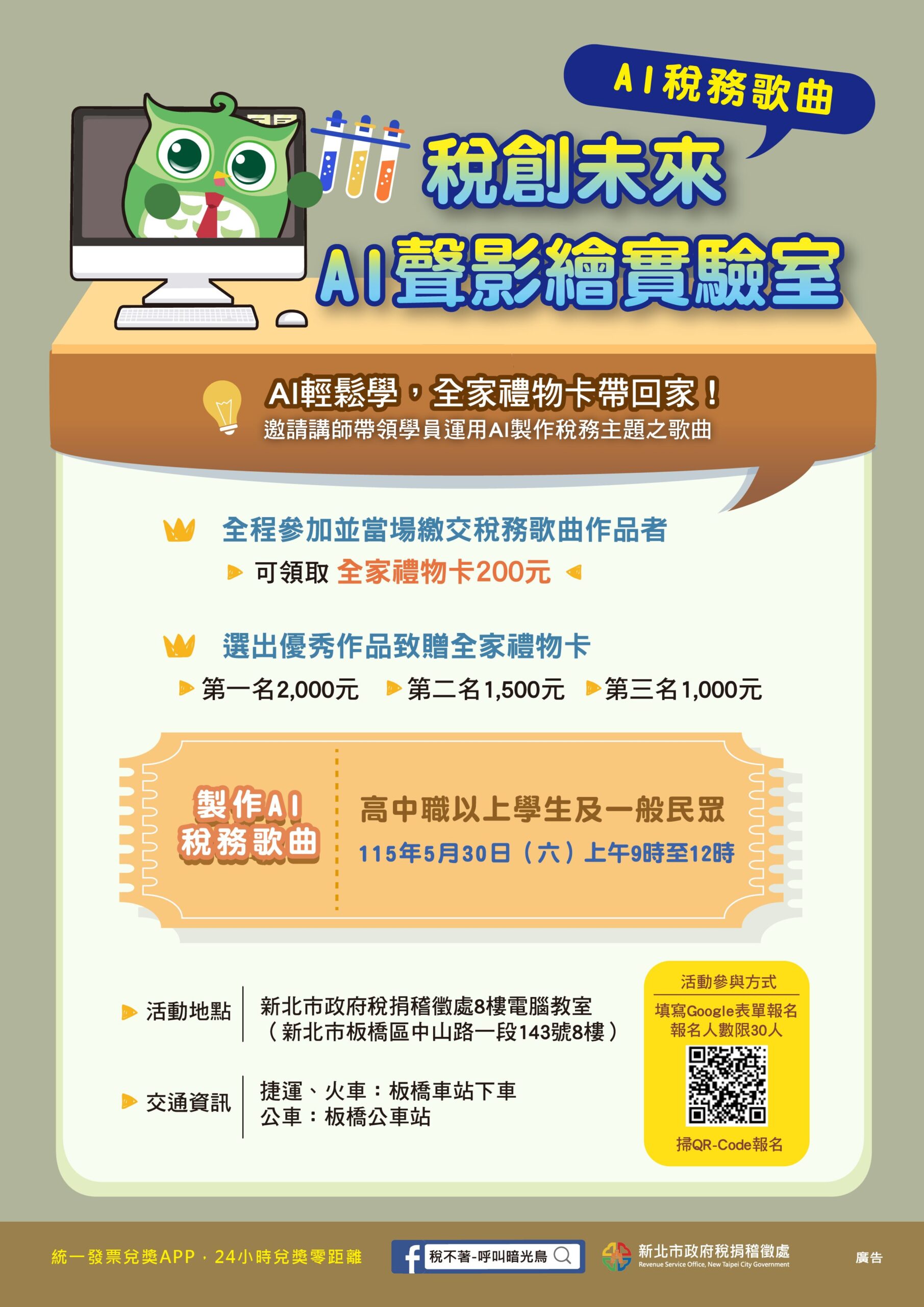 為推廣租稅教育,宣導誠實納稅、雲端發票及各項稅務知識,新北市政府稅捐稽徵處特別舉辦「稅創未來-AI聲影繪實驗室」-稅務歌曲輕鬆學租稅宣導活動,邀請具豐富AI授課經歷的講師,帶領學員運用AI製作稅務主題之歌曲。學員須全程參與課程並於當場繳交作品,完成稅務歌曲者可獲得200元全家禮物卡,評選為優秀作品致贈全家禮物卡,第一名2,000元、第二名1,500元、第三名1,000元。