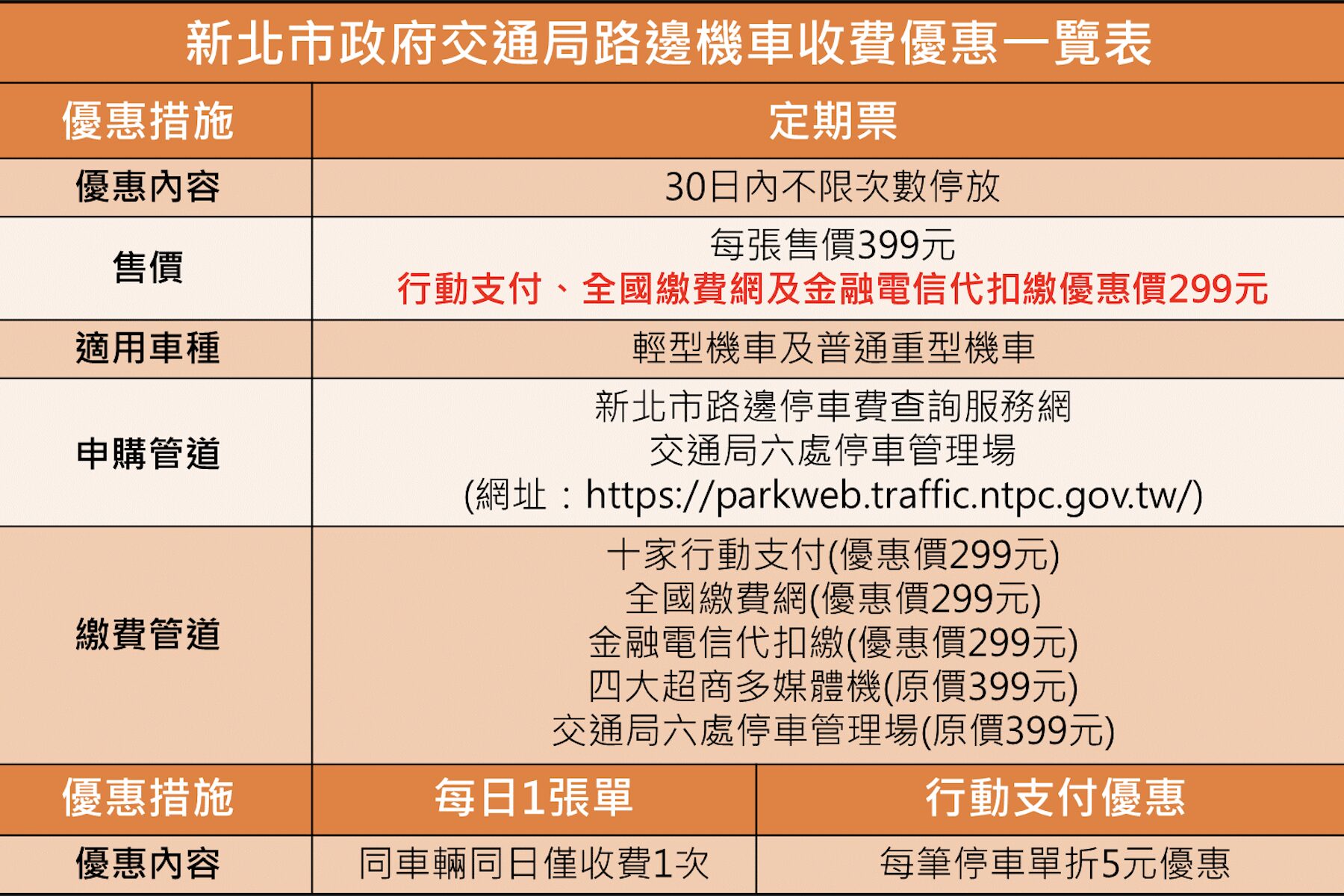 ▲路邊機車收費優惠一覽表。(圖/新北市交通局 提供)