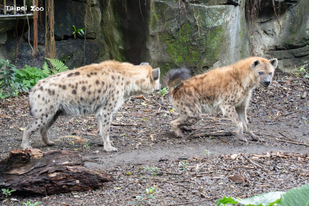 在斑點鬣狗的社會裡,「女力」當道,雌性個體不僅體型較大,地位也更高,這在肉食目動物中極為罕見。在臺北市立動物園的非洲動物區,可以觀察到斑點鬣狗雌雄互動既溫馨又逗趣的一面。保育員不定期會提供以麻布袋製作的行為豐富化「玩具」,沾上肉汁氣味或血水,讓斑點鬣狗發揮撲擊、啃咬物體的狩獵本能。兩隻斑點鬣狗中,雌性斑點鬣狗「小乖」較為強勢,經常會搶先探索行為豐富化物件並叼走獨佔,還驅趕好奇上前的雄性斑點鬣狗「小白」。因此斑點鬣狗「小白」只能趁對方「小乖」沒發現時,伺機找到麻布包偷偷嗅聞撕咬滿足一下好奇心。