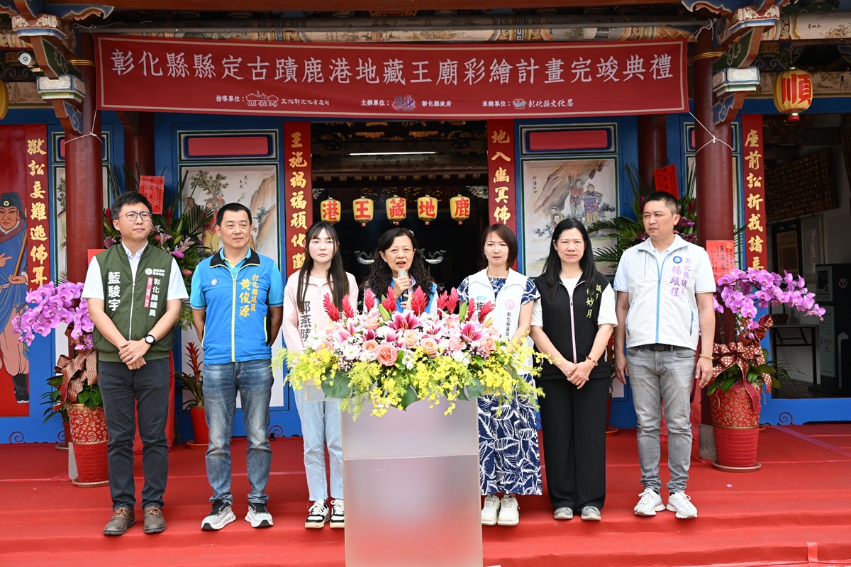 為保存珍貴文化資產並彰顯傳統工藝之美,彰化縣政府於今(28)日上午在鹿港地藏王廟舉辦彩繪計畫完竣典禮,縣長王惠美、鹿港地藏王廟主委許森樹與各級民代等人與會。共同見證古廟歷經歲月淬鍊,再現風華的嶄新面貌。王縣長表示,縣定古蹟地藏王廟創始於清朝嘉慶20年(1815年),當年由鹿港八郊重建天后宮的餘資撥建而成,形成鹿港「北天后、南地藏」的獨特信仰格局,象徵一司天、一司地守護聚落,承載兩百多年來移民拓墾與民間信仰的歷史軌跡,於民國74 年公告為縣定古蹟,是珍貴的人文瑰寶。112年由文化部文資局核定總經費1,195萬元,其中由中央補助70%,縣府自籌25%,廟方自備 5%,公私協力共同守護文資。