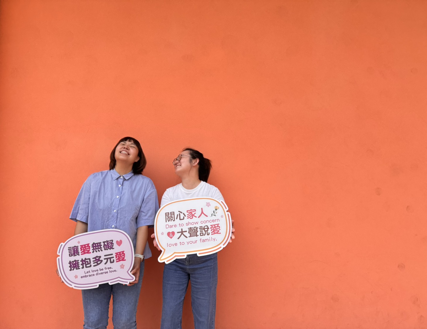 ▲新北家防中心同仁高舉「讓愛無礙 擁抱多元愛」及「關心家人 大聲說愛」手舉牌,呼籲大家穿著或行為都是多元表達的方式,把理解與尊重帶進日常生活中。(圖/新北市社會局 提供)