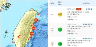12/8晚間花蓮近海發生有感地震 最大震度4級
