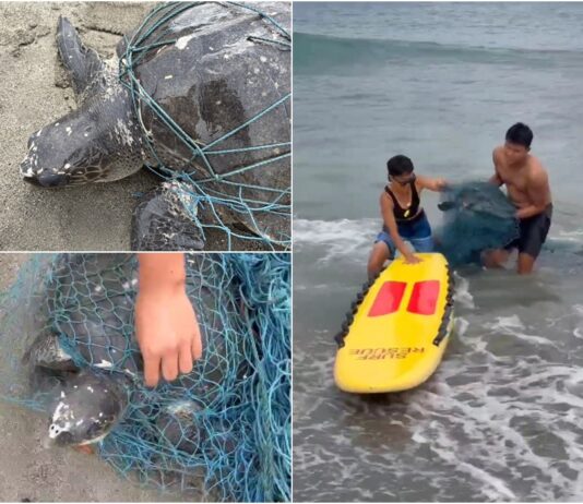 影音/「欖蠵龜」遭網纏困 海岸巡邏員即刻救援