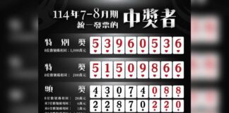 114年7-8月統一發票開獎 致富千萬獎號為「53960536」