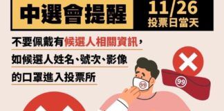 中選會提醒:11/26不可佩戴有候選人姓名、號次、影像口罩 進入投票所