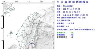 地牛翻身!台東近海11:43發生規模4.5地震 最大震度3級