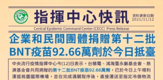 又一批民間捐贈BNT疫苗92.66萬劑抵臺