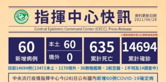 臺灣新冠至6/28累計14694確診635死 本土染疫13471人627亡