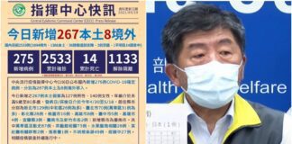 臺灣新冠5/19新增267本土8境外 共已2533確診14死1386隔離中