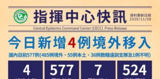 臺灣武肺11/8新增4境外移入 共已577人染疫 7死524解隔離