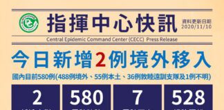 臺灣武肺11/10再添2境外移入 共580人染疫 7死528解隔離