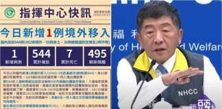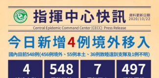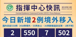 臺灣武肺10/24再添2境外移入  累積確診550例  7死502解隔離