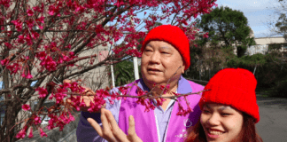 毛帽櫻花相映紅 八里愛心教養院志工親織百頂毛帽 溫暖教養院生