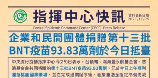 民間企業與團體捐贈BNT疫苗 又93.83萬劑抵臺