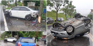 影音/疑因天雨路滑肇事 一車撞兩車後四輪朝天翻覆